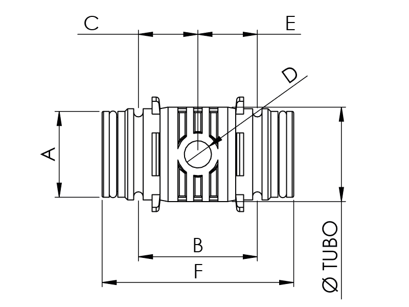 | CÓDIGO | A mm | B mm | C mm | D mm | E mm | F mm | TUBO Ø mm | |