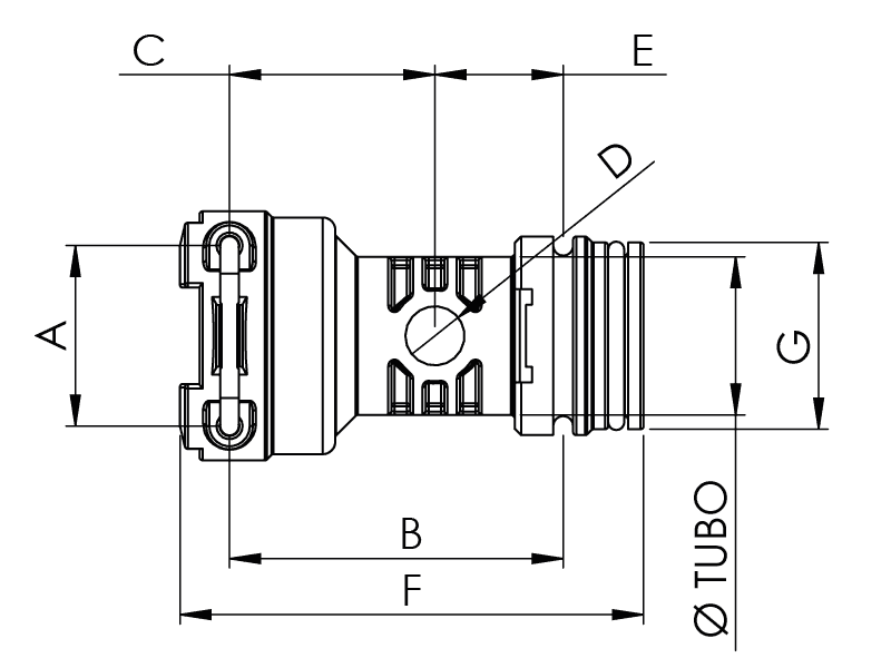 | CÓDIGO | A mm | B mm | C mm | D mm | E mm | F mm | G mm | TUBO Ø mm |