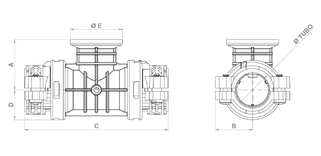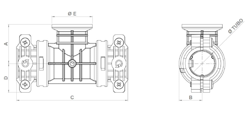 | CÓDIGO | A mm | B mm | C mm | D mm | E (mm) | TUBO (Ø EXT) | H | |